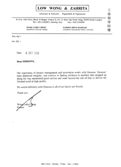 We would definitely refer Simsons to all of our family and friends." - Wong Loke Cheng, Partner of LOW WONG & ZAHRITA (Advocates & Solicitors)