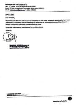 "We want to take this time to thank you for completing our new office. We greatly appreciate the hard work and Simsons's crews have done in completing this project for us. You have demonstrated that there are honest, trustworthy, and reliable contractors still out there." - NOORUSE SDN BHD